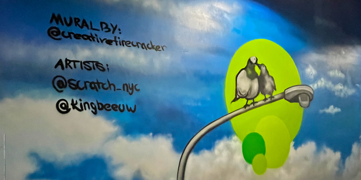 Custom mural featuring Bronx inspired icons and a sky that makes you want to walk on the clouds.