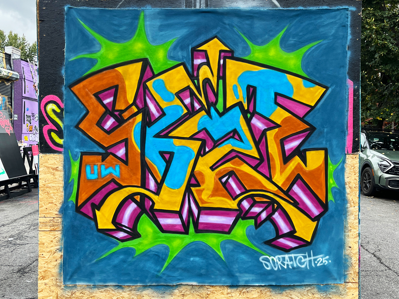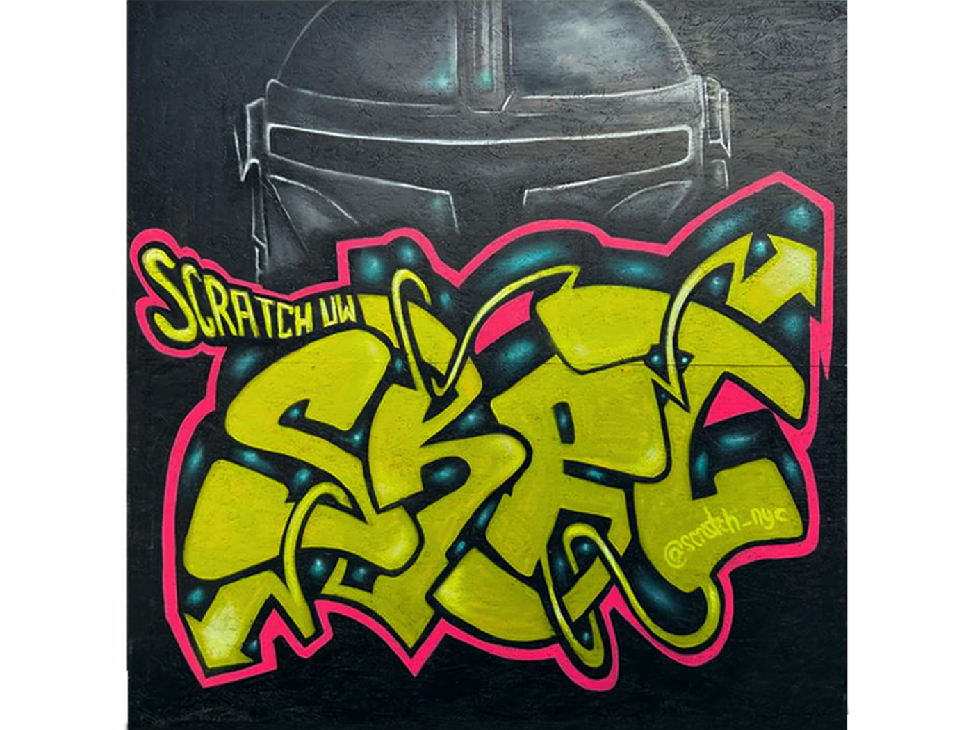 Graffiti piece by Scratch, characters on the left by VaseOne, background painted by Kingbee. Part of the UW Wall.